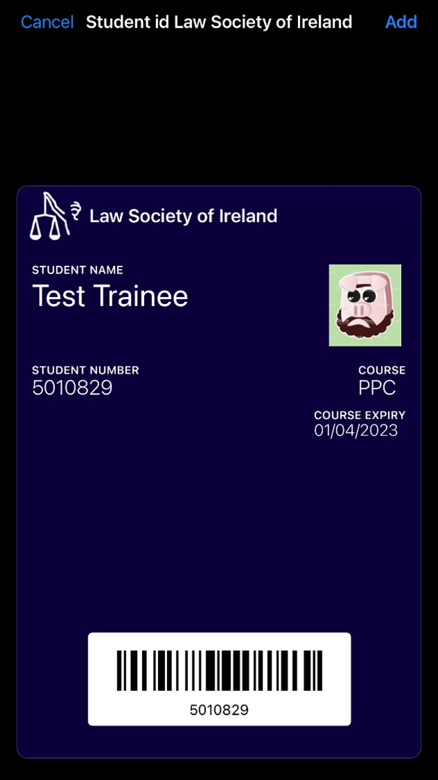 - Click the button to add it to the apple wallet and you will be presented with the student card and an option to Add.