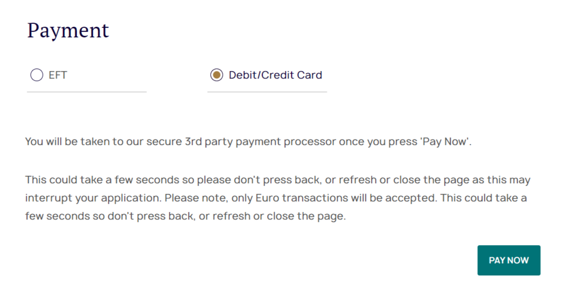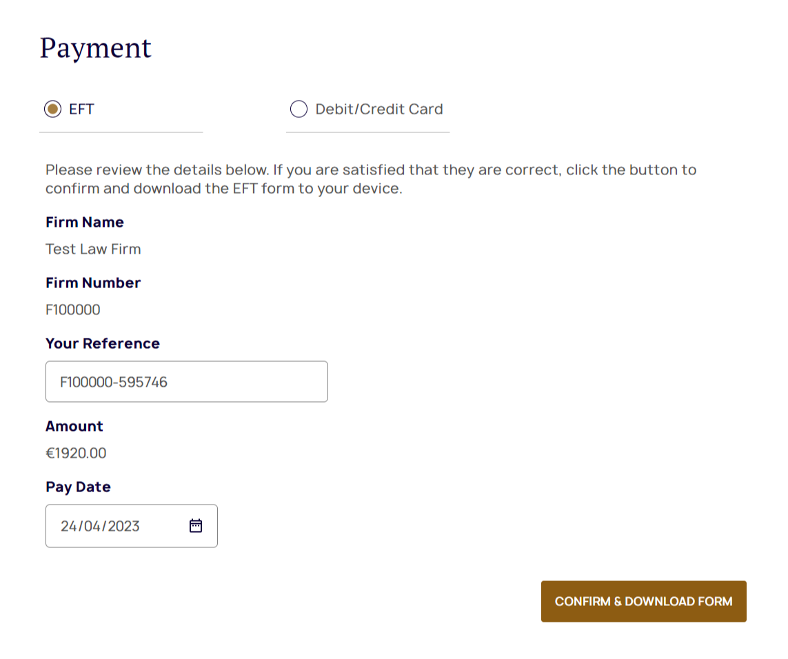If you opt for the EFT method, the payment system will create a document that you can download with details to make the payment through your own online banking system. It is important that the reference you use in your online banking system matches the reference in the Law Society payment system.