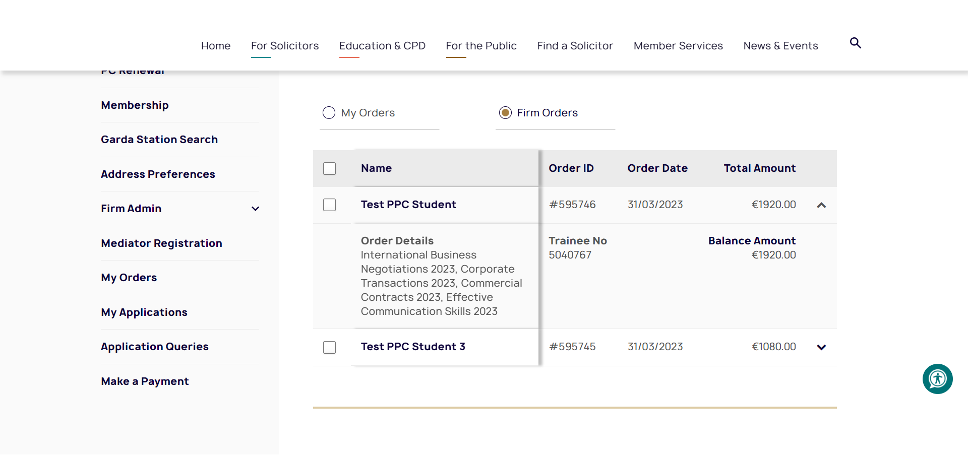 Training Firm partners or Training Officers already registered with the Law Society may also log in to the Law Society website and access the system. If a training firm would like to organise access to the payment system for another employee, such as the HR Manager or Office Manager, please provide a letter of authorisation (including the individual’s name and email address) from a partner in your firm to traineesection@lawsociety.ie. The team will then set up that individual with the relevant access on behalf of the firm.