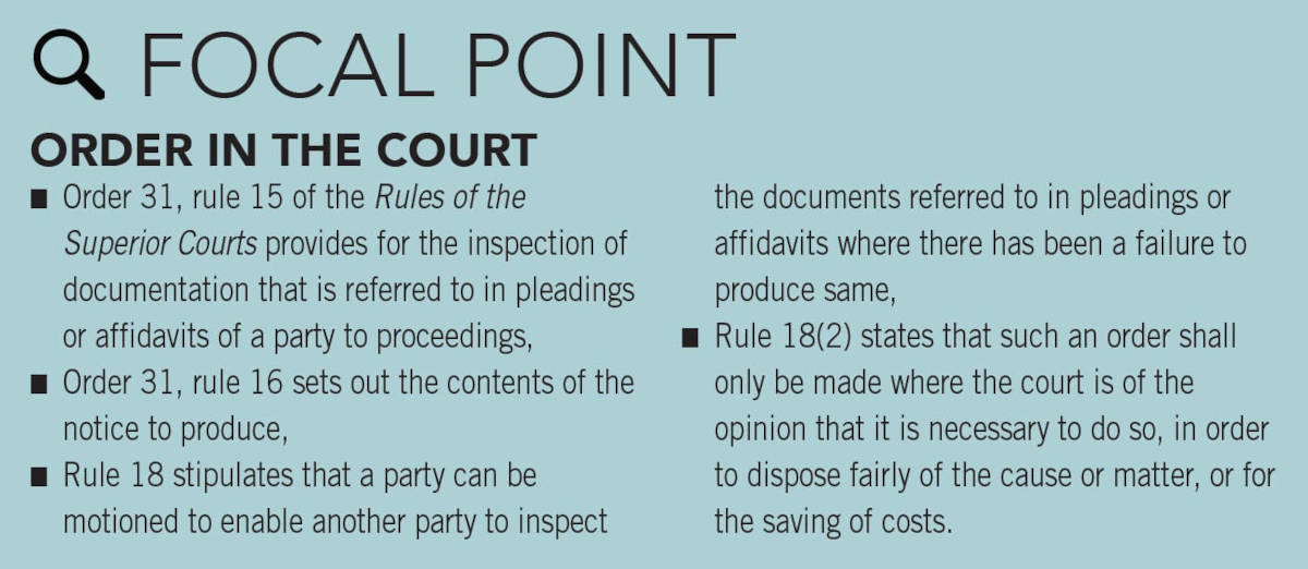 Noting that the burden lay with the party seeking inspection to show the necessity of full disclosure, Mr Justice O’Connor directed the defendants to categorise the redactions on affidavit, and to provide explanations for each redaction.
