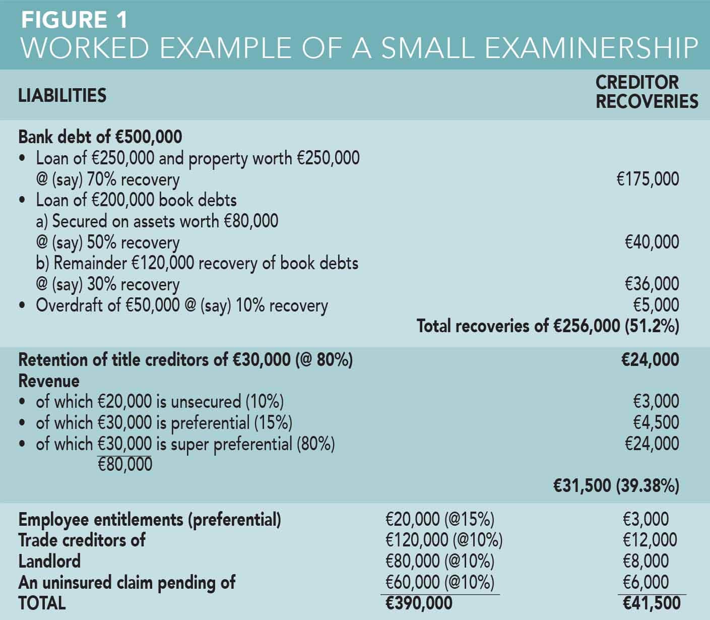 In Figure 1, I give a worked example of a typical examinership case. Here, bank and retention of title creditors accept payment when the business returns to turning over its trade, with the bank rescheduling payments over a longer period.