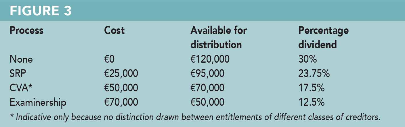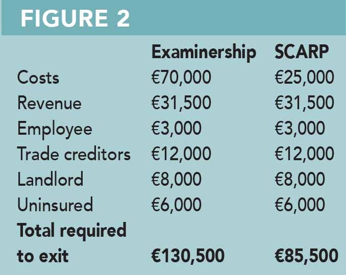 There are currently two restructuring options: a creditors’ voluntary arrangement (CVA) and examinership. Taking the cost of a CVA at €50,000 and examinership as set out above, including SCARP in the mix gives a fourth option – an agreed outcome to the restructure, based on avoiding restructuring costs.
