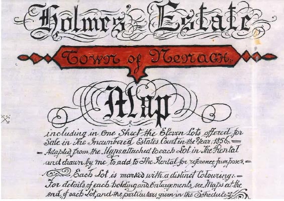 There is no doubt that hundreds of copies of the Holmes Rental, Maps and Particulars of Sale were prepared and distributed in 1856, but this copy, added to by the late Michael Gleeson, is unique in certain respects and, as such, is invaluable. Mr Gleeson, a solicitor, resided with his family in Summerhill, Nenagh. He was admitted to the solicitors’ profession in 1878.