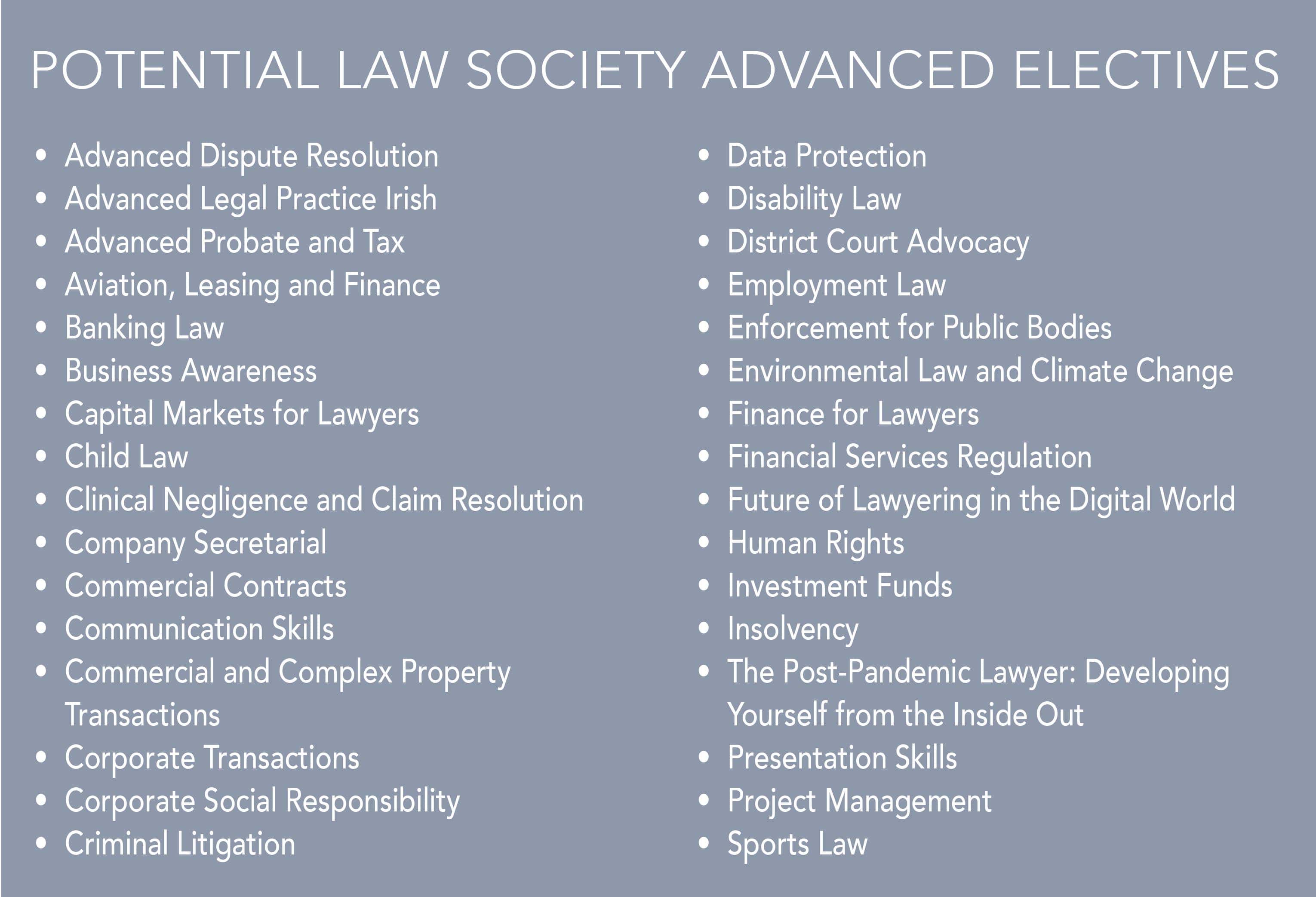 Trainees will have the opportunity to complete four or more advanced electives as part of their overall training. A programme of advanced electives will be provided by the Law Society, with others co-provided, and some being external advanced electives, accredited by the Society.
