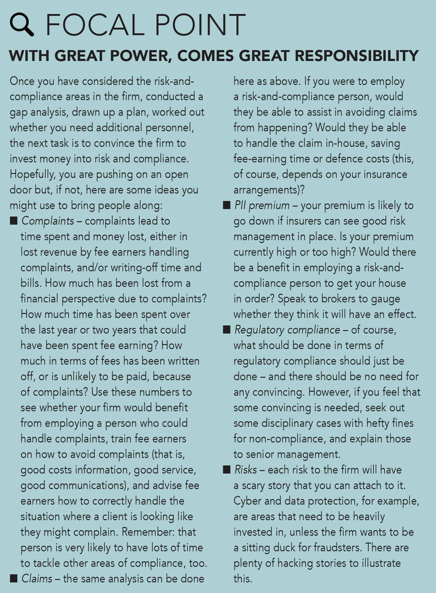 It is true to say that law firms are more regulated now than they have ever been, and there is often a need for a dedicated team – just as there is for HR, IT, or business development/marketing.