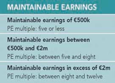 Des Peelo, a well-known author in the area of share valuations in Ireland, suggests the following PE multiples as a rough guide for valuing Irish companies in his book, The Valuation of Businesses and Shares: