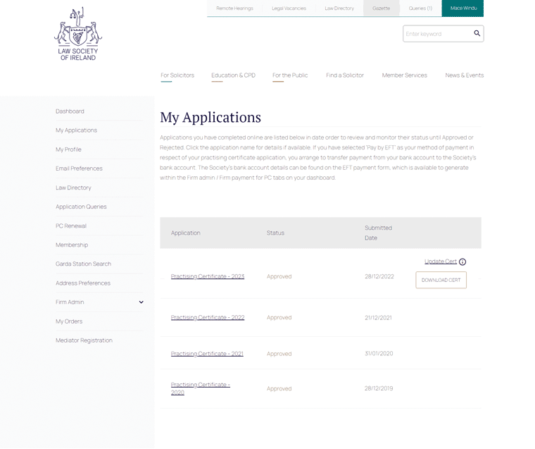 Click on the ‘Download Cert’ button beside your 2023 practising certificate application link to download your PC.